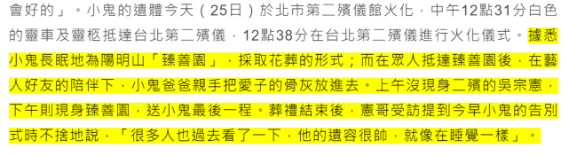 9月25日上午,家人为小鬼低调举行告别式,在入殓仪式结束后,他的遗体于中午时分被送到第二殡仪馆进行火化,一众亲友都有到场送别。