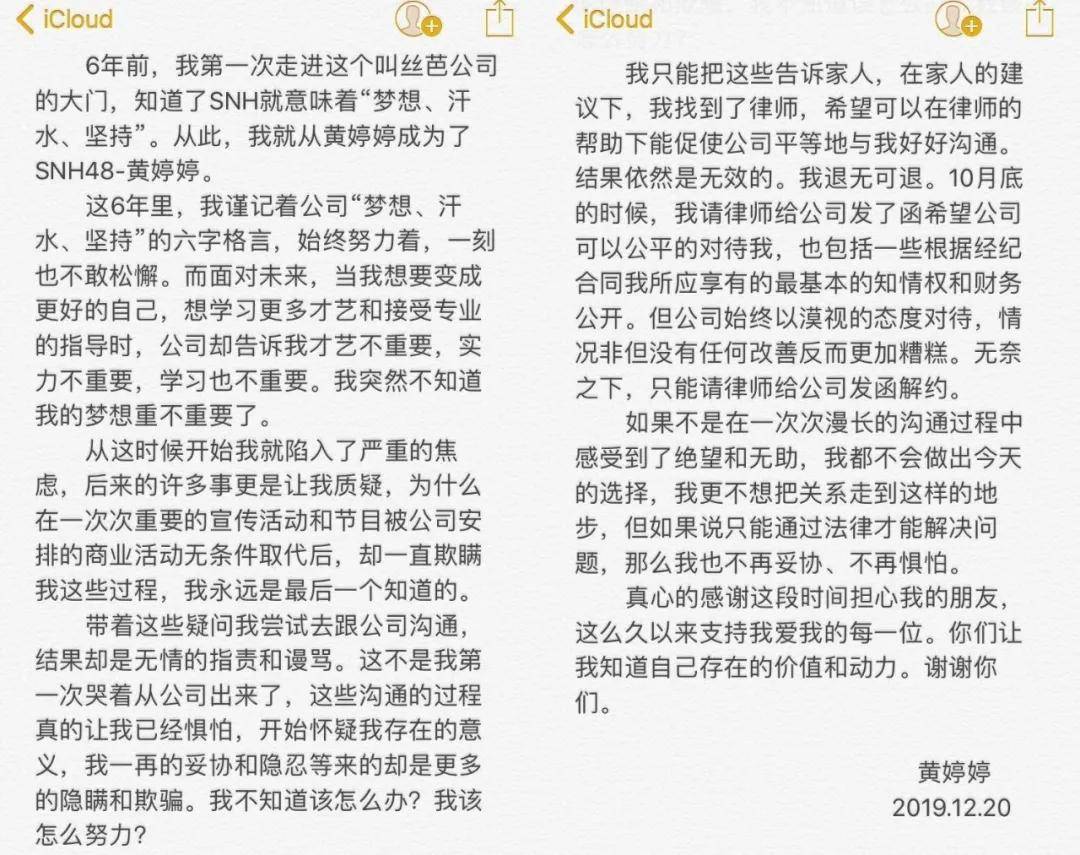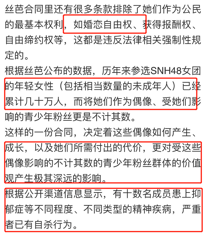 再来就是黄婷婷对公司的控诉,特别提到了恋爱禁止条约,认为公司剥夺了她们婚恋自由的权利,言语之间对公司风气和所引导的偶像文化很是不满,更是提到有数十名成员患上了抑郁症等不同程序、不同类型的精神疾病,甚至有人走上极端。