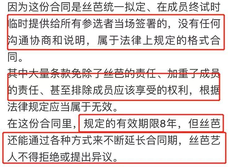 之后黄婷婷方还曝光了他们认为的公司签约的不合理之处,认为合约是临时签订,没有任何沟通协商和说明,属于格式合同,其中双方权利义务也不平等,所以应该判定是无效合同,并提到了合同规定有效期限是8年,但公司会通过各种方式延长合同期,这也顺道解释了为何黄婷婷合约还有1年就到期了可她还是要提出解约。