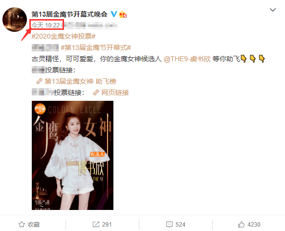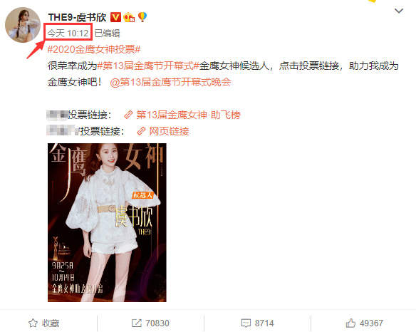 在官方公布虞书欣入选金鹰女神候选人的十分钟之前,虞书欣本人就已经带话题宣布自己成为了金鹰女神候选人,同时还带上了投票链接,没想到虞书欣为了能当选今年的金鹰女神都开始亲自下场拉票了。