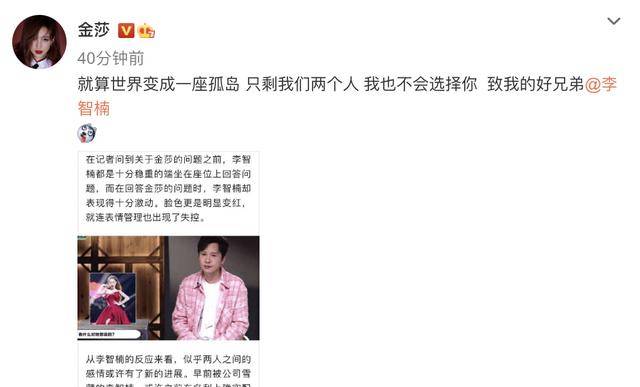9月25日晨,金莎再次发文,晒出了某自媒体写的文章:就算世界变成一座孤岛,只剩我们两个人,我也不会选择你,致我的好兄弟李智楠!