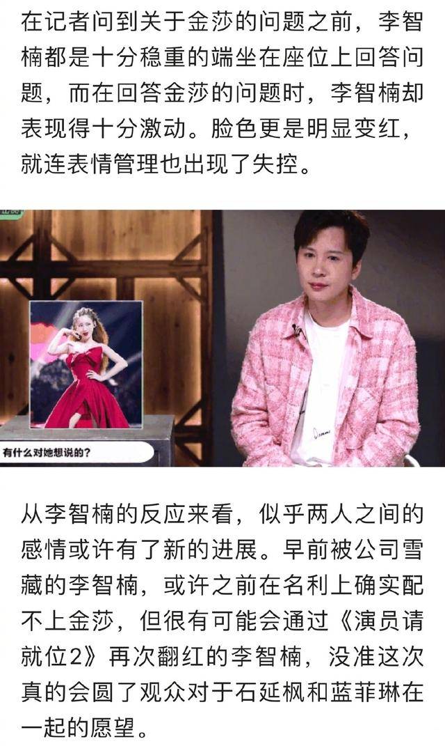 因此两人被质疑关系不浅,甚至有恋爱的嫌疑。此前李智楠因为被公司雪藏而被指配不上,现在因《演员请就位2》翻红,与参加《浪姐》归来的金莎“门当户对”。