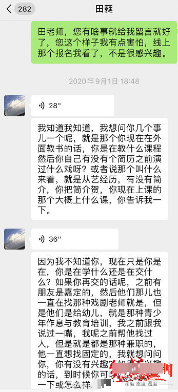 在曝光的聊天记录中显示,在事发后的这天晚上,田蕤曾在微信上询问该女生:“你喜欢我吗?”对方还问:“你喜欢和我接吻吗?”A女士先是一愣,接着回答:“不知道。”田蕤说:“这也算是一种答案。”此外,不知道是为了弥补过错还是为了示好,聊天记录中田蕤还向该女生提供了职业规划的选择,利用自身的影响力为其介绍资源。
