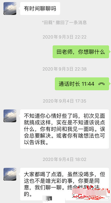 不过聊天记录显示,该女生拒绝了田蕤的安排。或许是看这条路走不通,田蕤又开始约该女生见面,希望当面解释,“我们聊一聊,终会找到办法的”。不过该女生显然很理智,案发后该女生在朋友的陪同下,选择了报警。
