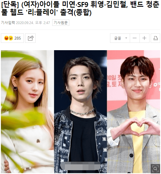 9月24日,据韩媒报道,韩国人气组合(G)I-DLE成员赵美延(미연)和SF9成员金辉映(휘영)以及演员金敏哲(김민철)将合作出演由Heart Peple 制作的网剧《Replay(리플레이)》。