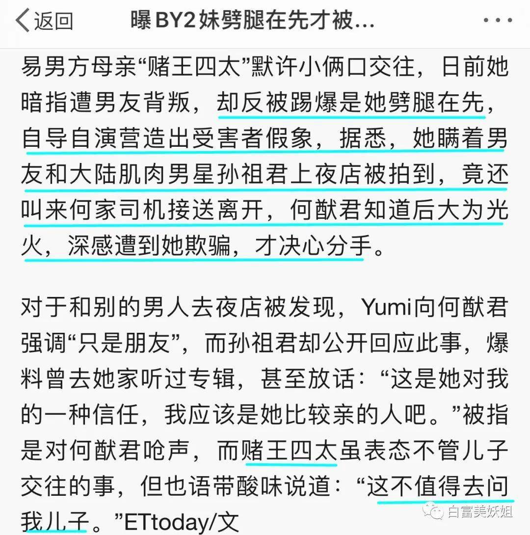 不过据台媒报道,是Yumi偷吃内地十八线男星孙祖君,出轨在先才被何猷君甩。