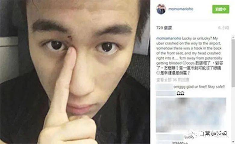 4月何猷君在美国搭Uber去机场发生车祸,右眼眼角受伤差点破相。