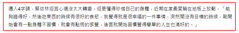 此外,9月15日蔡依林刚过完40岁生日,一群好友和蔡依林的妈妈扮成MV中的角色,一起为她跳舞庆祝,给了蔡依林很大的一个惊喜,如今迈入4字开头,蔡依林也没太多的感慨,只是更加懂得珍惜自己的身体,喜欢在家躺在地板上放松做运动,起初这样没有目标的生活也让自己觉得有点慌,但开始习惯后就觉得简单的人生也挺好的。