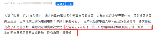 据台媒9月24日报道,台湾男星陶传正24日在接受采访时,竟直言自己想与小鲜肉演爱情戏,话一出口简直语惊四座。众人为什么会如此震惊,因为陶传正现年已经74岁了。要是一个正值青年或中年的男演员说这话可能效果还没有这么惊人,但从一个70多岁的老人口中说出来,真是让人头皮发麻。不得不说,陶传正还真是紧跟潮流,一点都不服老。