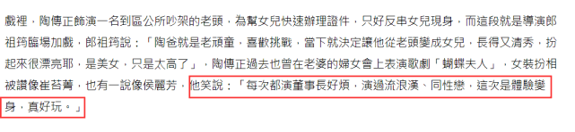 2019年陶传正终于正式从企业界退休,日子也变得悠闲了很多,然而他还没有卸掉自己演员的身份。近期受邀参演了某电台的作品,原本他在剧中只是客串一个路人甲,连台词都没有几句,但导演郎祖筠为了给他加戏,竟直接让他从一个老头摇身一变成了“女儿身”。