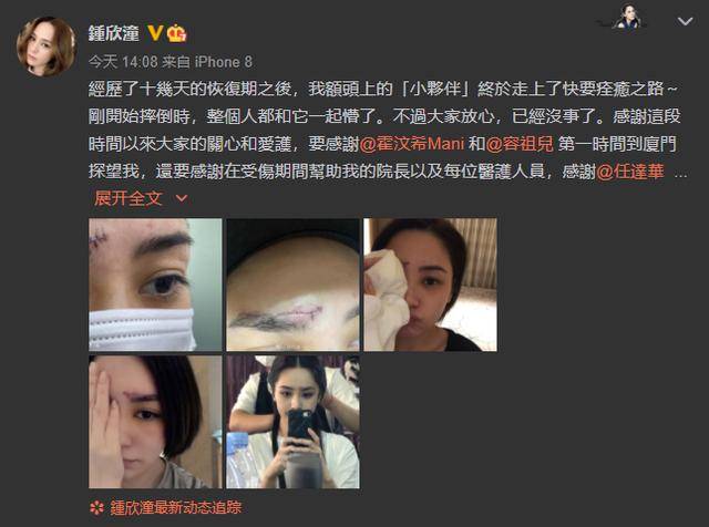 9月24日下午,钟欣潼发表动态表示伤疤即将痊愈。