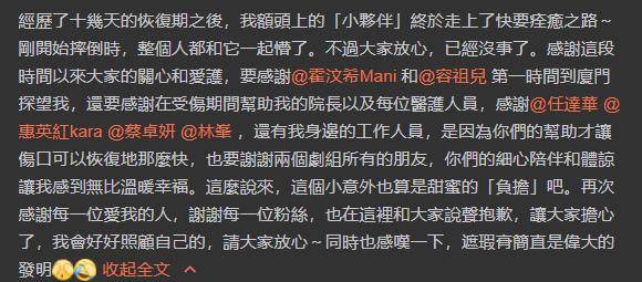 她感谢了第一时间到场的霍汶希与容祖儿,也感谢在其伤口恢复上作出贡献的任达华、惠英红、蔡卓妍、林峯与医务人员。