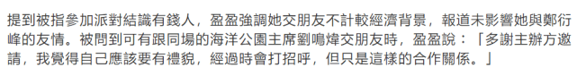 被现场记者问到,有没有与同场的刘鸣炜“交朋友”时,冯盈盈说:“多谢主办方邀请,我觉得自己应该要有礼貌,经过(他身边)时会打招呼,但只是这样的合作关系。”