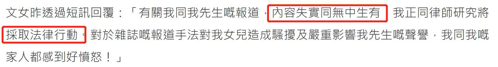 随后,文颂娴又通过短信回复媒体,她表示老公深陷财务危机的报道属无中生有,称该报道已经严重影响了老公的声誉并对女儿造成了骚扰,直言将采取法律行动,相当维护家庭。