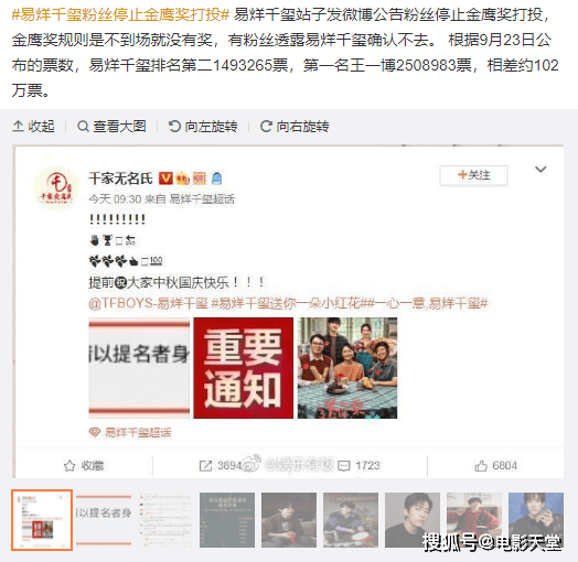 无论如何,粉丝这次叫停金鹰奖的打投也算是及时止损的明智之举了,希望千玺的新电影能够继续大卖,也希望在十月下旬的百花奖有所斩获吧。