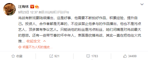 但是让人感到意外的是,最近汪海林却突然改口帮肖战说起了话。他发文表示肖战有新戏陆续播出是好事,只有不断拍好作品累积经验才能提升自己,他也明确表示跟肖战合作的演员、投资者是无辜的,所以不应该抵制肖战的新剧。