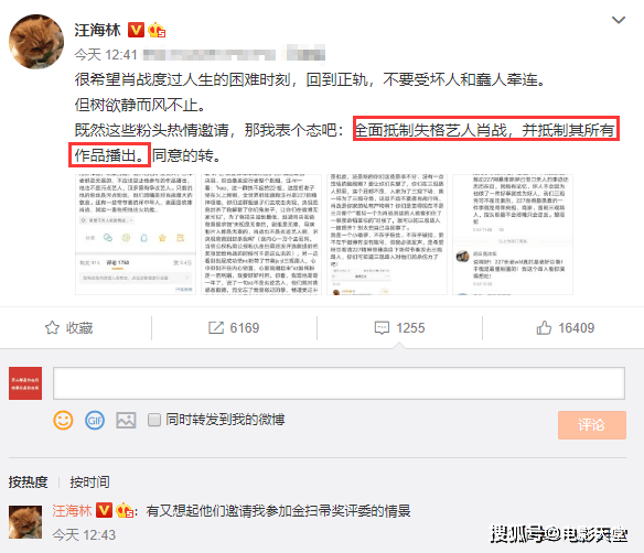但是谁能想到汪海林刚刚声援肖战24小时,他就又突然改口,从支持肖战复出变成了“全面抵制是个艺人肖战,并抵制其所有作品播出”。