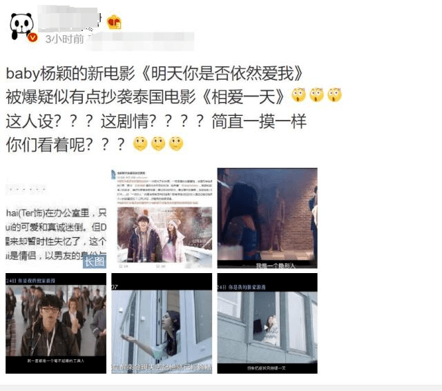 演技还没讨论完,电影又被爆丑闻了。9月24日,有网友发现杨颖主演的《明天你是否依然爱我》疑似抄袭2016年上映的泰国电影《相爱一天》。前者有“一日恋人”的内容而后者是“失忆一天”,两者的剧情有异曲同工之处。不仅如此,两部电影的台词和画面也出奇的相似,说是“纯属巧合”可信度较低。