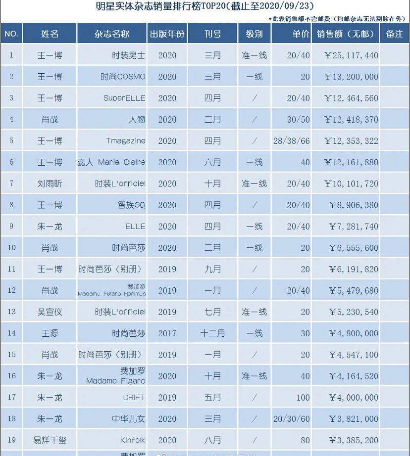 看这架势,实体杂志销售额,带货能力最强的就是王一博,其次是肖战,然后是朱一龙,这三个人包揽了男性杂志的前20强最给力的销售额。