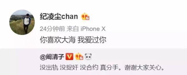2018年7月1日,阚清子的一句:“没出轨,没捉奸,没合约,真分手”,和纪凌尘的一句:“你喜欢大海,我爱过你”而结束了三年之久的感情。