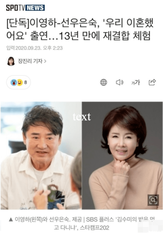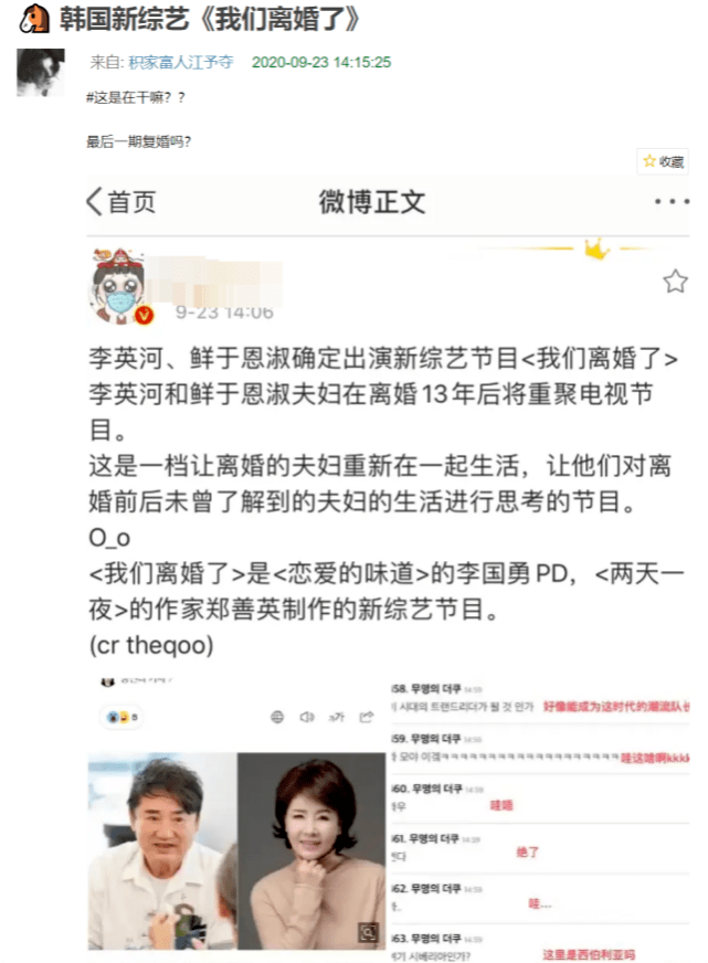 韩媒9月23日又曝出韩国即将推出一档新综艺《我们离婚了》,节目会邀请多对已离婚的明星夫妇,让他们在节目中重聚 ,然后对他们离婚前后未曾了解到的夫妻生活再次进行思考,相当于作为过来人反思一下失败婚姻产生的原因。目前已经确定李英和、鲜于恩淑夫妇会参加,这也是两位在离婚13年后首次重聚电视节目。