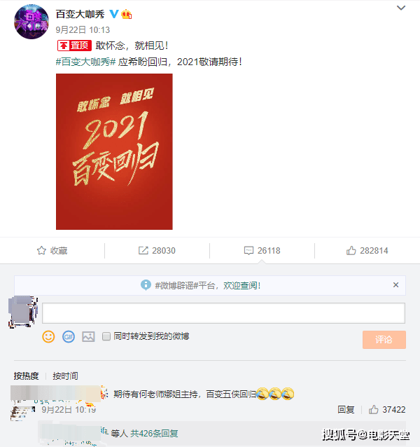 当然了,《歌手》系列的终结并不意味着洪涛的总导演之路也要终结,因为同一天,《百变大咖秀》的官博突然发布了一条2021即将回归的微博,这让很多人非常意外,毕竟最后一季《百变大咖秀》是在2014年播出的第五季,没想到时隔六年,《百变大咖秀》将又要回到观众眼前,真的是太让人期待了,无数人在下面留言称不需要太大的改动,只要原班人马回来就想了,他们实在是太想念娜姐和何老师了。