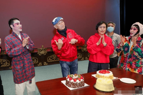 照片中罗家英和汪明荃夫妇俩身穿红色外套,一众友人围绕在两人身旁为罗家英献上生日歌。