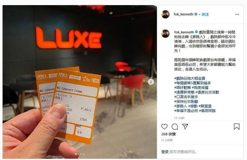 9月22日,霍启刚在社交平台发布了新动态,霍启刚称电影院重开之后,自己和郭晶晶第一时间去看了电影《麦路人》,他还忍不住感叹,电影院现在还是冷冷清清。配图中,霍启刚手里拿着两张电影票,背景里确实没有什么人。