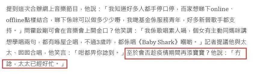 前段时间网上疯传郭晶晶即将拼4胎,随后便遭到了霍启刚的否认,他感慨道:“太太已经好忙”他提到自己的小孩最近都要在家上网课,郭晶晶不仅要下载和辅导孩子们的功课,还要安排他们的时间,很是辛苦。霍启刚不忍心郭晶晶如此劳累,所以才坚决不生4胎,可见他对郭晶晶的宠爱与贴心。