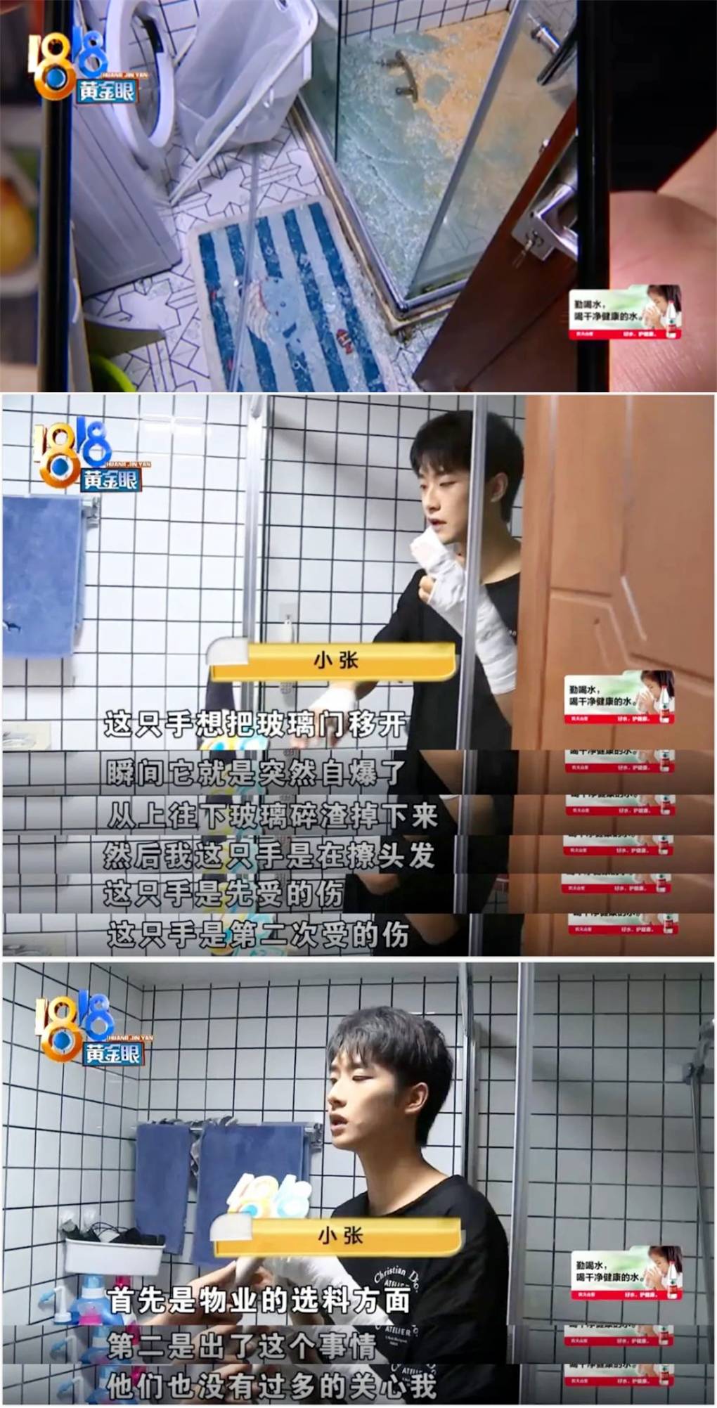据小张所说,事发当时,自己刚刚洗完澡,一只手撩头发一只手正准备打开浴室门,谁想浴室的钢化玻璃门突然爆裂,碎成渣渣的玻璃从上往下砸伤了他的手。至今治疗已花费超过八千元。可是不管是物业还是公寓,两方都没有给到满意的善后处理,甚至都没有关心他!所以他要上节目讨个说法。