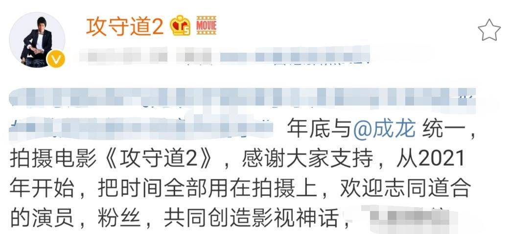 随即,飞龙还对自己的未来做出了展望:“年底与成龙统一,拍摄电影《攻守道2》,感谢大家支持,从2021年开始,把时间全部用在拍摄上,欢迎志同道合的演员,粉丝,共同创造影视神话。”
