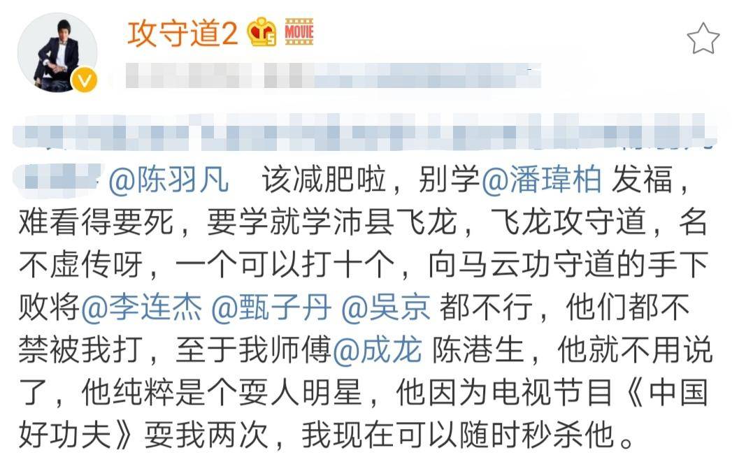 对此,飞龙劝陈羽凡还是应该多多锻炼,减减肥,这样以后才能重新出现在舞台上:“陈羽凡,该减肥啦,别学潘玮柏发福,难看得要死,要学就学沛县飞龙,飞龙攻守道,名不虚传呀,一个可以打十个,像马云功守道的手下败将李连杰、甄子丹、吴京都不行,他们都不禁被我打,至于我师傅成龙陈港生,他就不用说了,他纯粹是个耍人明星,他因为电视节目《中国好功夫》耍我两次,我现在可以随时秒杀他。”