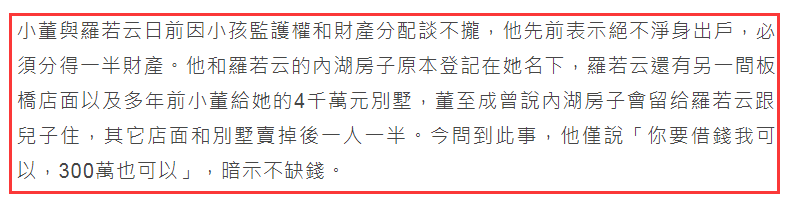 而离婚协议拖到至今,起初是因为两个人的财产谈不拢,董至成认为自己在这段婚姻当中付出很多,而女方婚后都没工作,他名下的不动产、积蓄都是他拼了老命赚的,所以它拒绝净身出户,并且要分得一半财产,登记在内湖的4000万(折合人民币930多万)房子会留给儿子和妻子住。