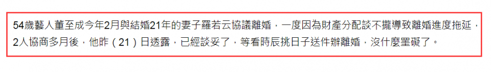 9月22日,据台湾媒体报道,54岁的董至成今年2月和结婚21年的老婆罗若云婚变,女方提离婚,双方协商多月,日前董至成在某节目中透露,太太已经同意,就差选日子去办理手续了。
