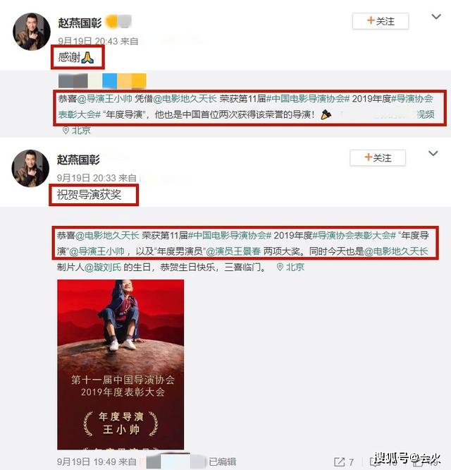 赵燕国彰也十分懂得感恩每一个机会和每一个选择自己的导演。9月19日,在导协年度表彰大会中,王小帅导演凭借电影《地久天长》,获得了导协表彰大会的"年度导演"的殊荣,赵燕国彰还在社交平台上特意为导演送去了自己的祝福。