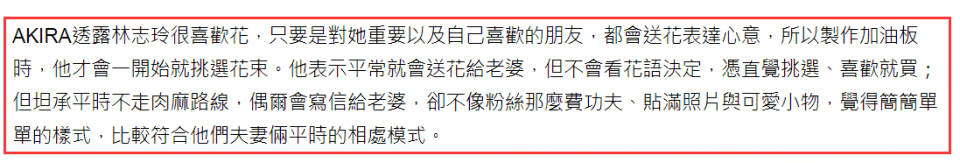 这一次为老婆制作应援板,第一步就是把代表着真爱的红色满天星布满板子,而之所以选择花,是因为林志玲很喜欢,他经常送花给老婆,平时私下里偶尔也会写信给林志玲,简简单单的样式,符合他们夫妻俩平时的相处模式。