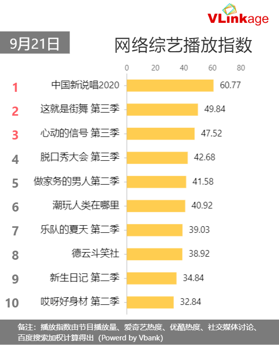 【网综榜单】9月21日当日#网络综艺播放指数#:1.#中国新说唱2020# 播放指数 60.77 2.#这就是街舞 第三季# 3.#心动的信号 第三季# 4.#脱口秀大会 第三季# 5.#做家务的男人第二季# 6.#潮玩人类在哪里# 7.#乐队的夏天 第二季# 8.#德云斗笑社# 9.#新生日记 第二季# 10.#哎呀好身材 第二季#