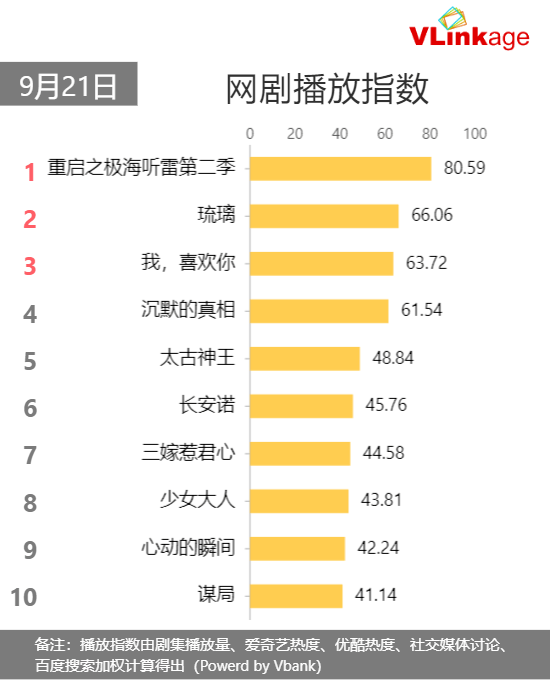 【网络剧榜单】9月21日当日#网剧播放指数#:1.#重启之极海听雷第二季# 播放指数 80.59 2.#琉璃# 3.#我,喜欢你# 4.#沉默的真相# 5.#太古神王# 6.#长安诺# 7.#三嫁惹君心# 8.#少女大人# 9.#心动的瞬间# 10.#谋局#