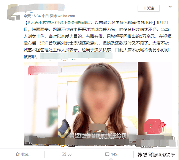 9月21号,据一名姓刘的女士爆料,大唐不夜城的不倒翁小哥哥以恋爱为名借走了她6万多元,至今只还了3万多,剩下的钱一直没有还过,感到被欺骗的刘女士万般无奈之下,她只能求助于媒体,希望可以借助网络的力量让不倒翁小哥哥出来回应和还钱。