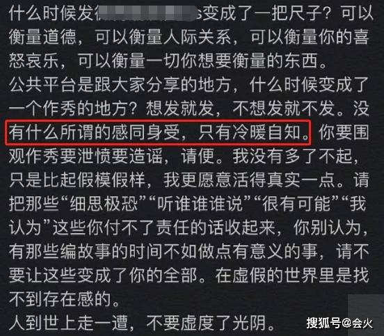 “社交平台不是衡量道德的尺子,冷暖自知,拒绝作秀。”