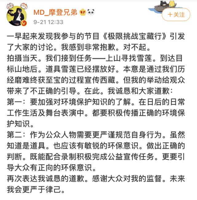 但随后节目组给出的道歉声明大家并不买账,被说避重就轻,还让飞行嘉宾在热搜上被骂了一天。的确,刘宇宁挺惨的。但不管怎么说,即便是嘉宾,对于这种珍稀植物的采摘行为,也应该自己有一个判断。毕竟,这一次如果不是道具,那到底谁来受这个惩罚呢?最后还是嘉宾来背锅。