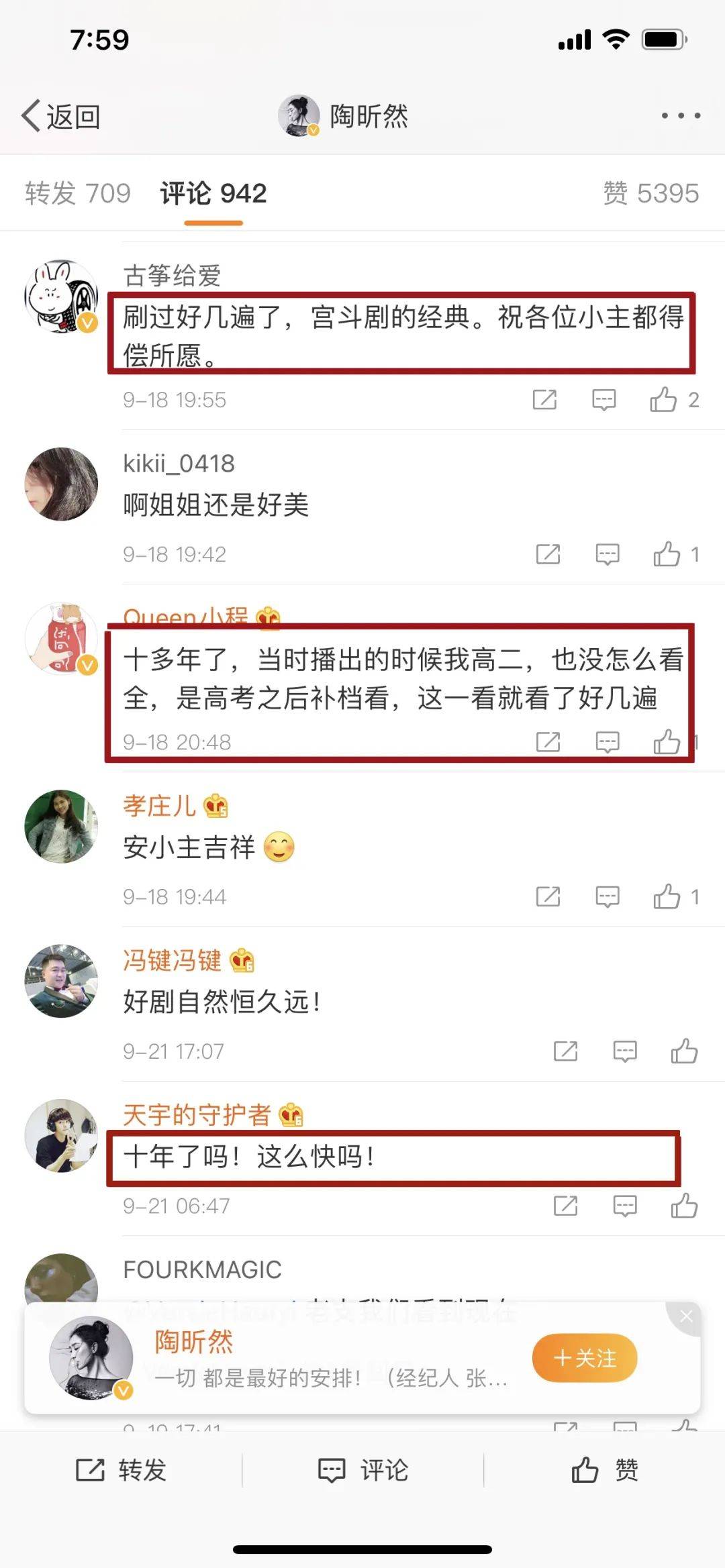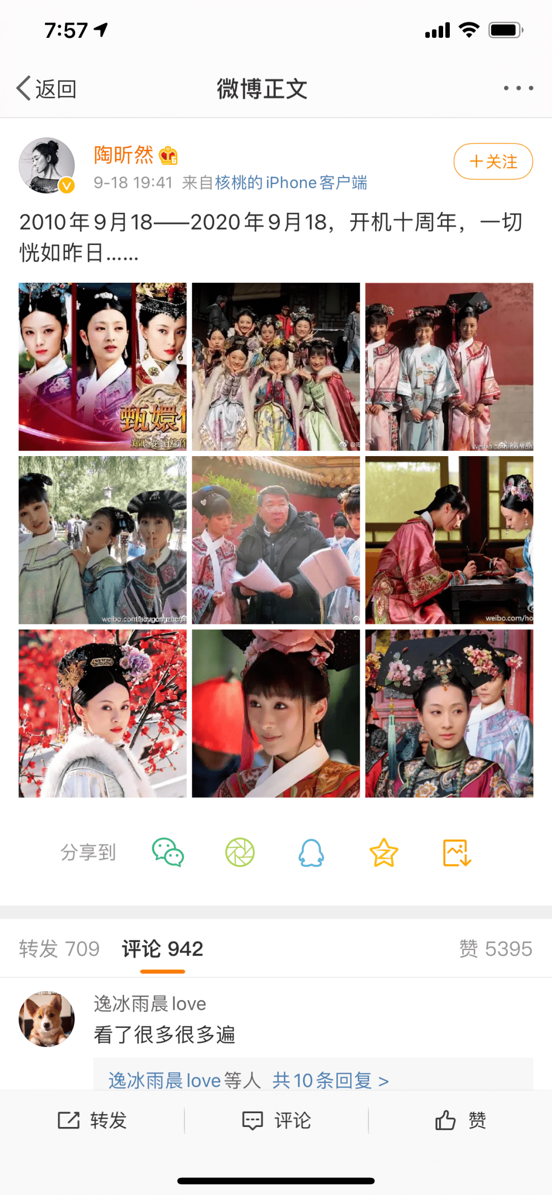就在前两天,该剧主演之一安陵容的扮演者陶昕然发文纪念《甄嬛传》开机十年,从2010年到2020年,开机十周年,一切恍如昨日。很快《甄嬛传》的剧粉就攻占了这条微博。大家纷纷留言,不知不觉十年了我们还在反复观看,经典就是经典,永远无法超越。