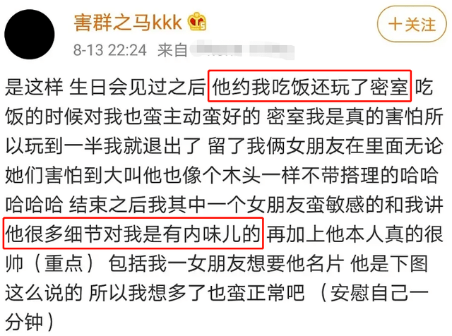 早在8月13号李由在小号发文说自己在某爱豆生日会之后,被他约出去吃饭,还一起玩密室,李由说男星对她挺主动的,身边朋友也说这个爱豆对她有好感。