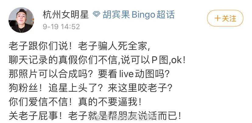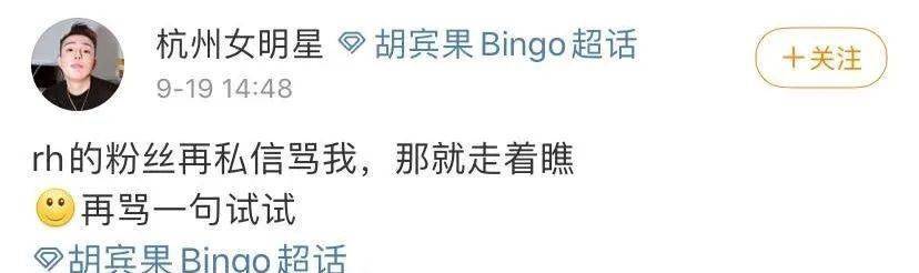因此胡宾果也遭到了任豪粉丝的网络暴力,随后他再一次警告粉丝“聊天记录可以合成的话,那你们要看动图吗?rh粉丝再私信骂我,那就走着瞧。”
