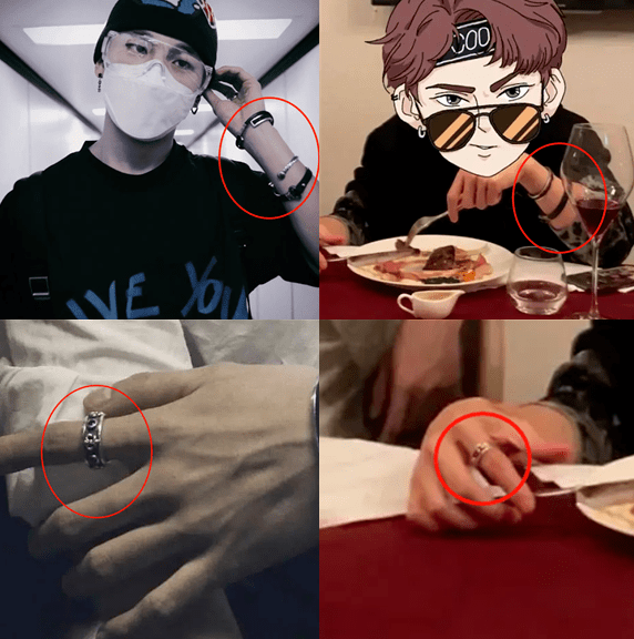 其次就是中间这位配饰最多的爱豆,照片中他的手上戴满了戒指手镯,而这些同款被指曾出现在壶团的另一位成员姚琛手上。