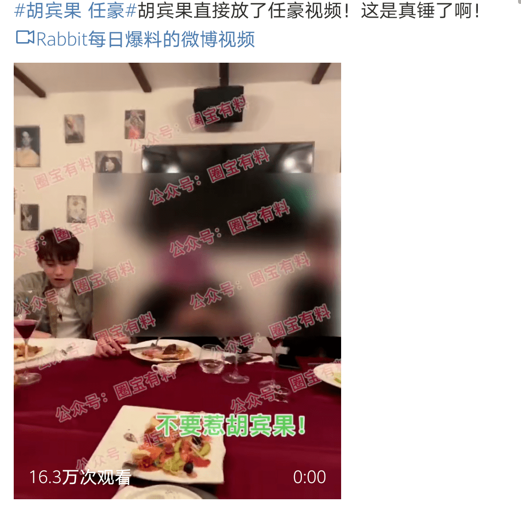 然后胡宾果真的直接放出了当时吃饭时的视频,其中只有任豪一个人露脸,另外两个爱豆都被马赛克,而任豪的穿着就是女网红晒图的同款穿着。