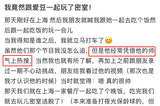 女网红在自己的账号发文说“我竟然跟爱豆一起玩了密室!”还说“虽然他们那个节目我没怎么追,但他经常凭借着帅气上热搜。”