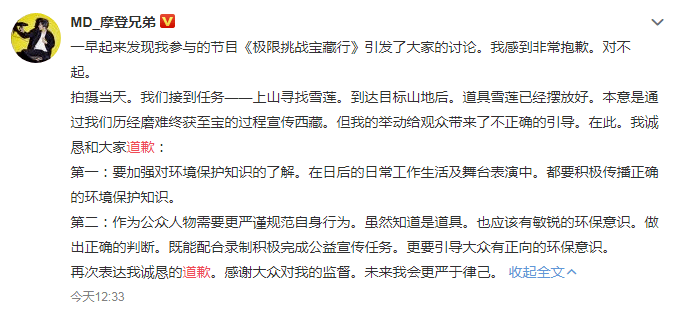 当期节目录制过程中,由于我们细节设计上的失误,尽管没有实际发生采摘珍稀植物的行为,但是节目播出后产生了一定的负面影响,没有起到宣传好珍稀植物保护规定的作用。