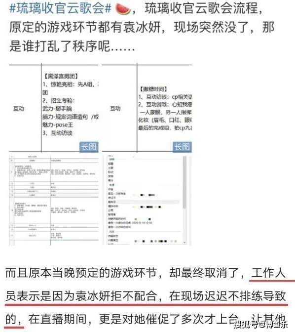据活动工作人员爆料,原本当晚有一些游戏环节,但因为袁冰妍拒不排练耍大牌,所以因故取消了。不过也有网友猜测,先前袁冰妍的公司炒CP用力过猛,欢瑞这边很不满意,因此很早就开始冷落袁冰妍了,袁冰妍不排练也只不过是正常反应。