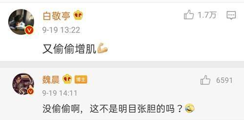 魏晨之前晒的生活照没有胡须,也没露肌肉,看不出来身材有多大的变化。这次照片一出来,就像好友白敬亭评论的一样:又偷偷增肌。魏晨也搞怪回复:没偷偷啊,这不是明目张胆的吗?看来两位健身达人私下经常一起在健身房撸铁。现在的男明星都是那种脱衣有肉穿衣显瘦的身材吗,流口水了。